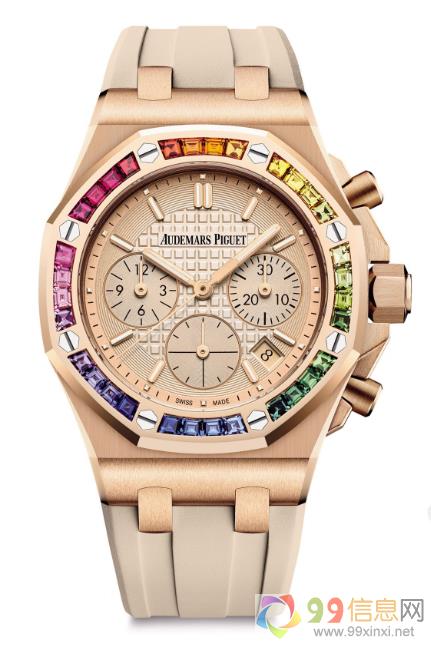 爱彼皇家橡树离岸型系列26236OR.YY.D085CA.01腕表,对于绝大多数女性和手腕较细的男性而言,常规42、44毫米的皇家橡树离岸型系列腕表可能不太好驾驭www.99xinxi.net99信息网。而37毫米就对这部分消费者友善了很多。这枚37毫米直径大小的“彩虹圈”采用18K玫瑰金表壳,搭配防眩光处理蓝宝石水晶玻璃表镜,镶嵌“彩虹色”长方形切割蓝宝石的表圈。宝石按照渐变颜色排列,32颗长方形切割“彩虹色”蓝宝石,总重约2.45克拉(表圈)9.9.信.息.网。不一样的彩虹圈,藏在在精致的细节之中。烟熏玫瑰金色表盘镌刻 “Lady Tapisserie”格纹装饰,搭配玫瑰金色副表盘,玫瑰金荧光立体时标和皇家橡树指针。18K玫瑰金表壳和橡胶材质的表带99xinxi.net。表壳直径为37毫米,表壳厚度控制在12.4毫米左右,在手腕上不至于没有存在感,却也不会给佩戴者带来太大负担。18K玫瑰金按钮和旋入式表冠。米色橡胶表带搭配18K玫瑰金AP字样折叠表扣9_9_信_息_网。这枚全新的皇家橡树离岸型腕表搭载品牌自制的Calibre 2385自动上链机芯 ,具备40小时动力储存和50米的防水深度。同时具备计时功能,小时,分钟,小秒钟及日期显示等功能。总结:这枚爱彼皇家橡树离岸型系列自动上链计时码表彩虹圈的国内售价为516,000元,并已登陆国内各大门店9.9.信.息.网。想要把彩虹握在自己的手中?不妨把这枚彩虹圈带回家。
