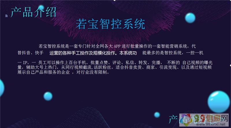 智控系统是一套专门针对短视频APP进行批量操作的一套智能营销系统,代替了抖音运营的各种手工操作及规模化操作。一个人就可以操作上百甚至上千台手机,一机一卡一IP,全自动化模拟人工操作,批量点赞,评论,私信,转发,完播,不断的增加自己视频的曝光量,辅助大号上热门,从同行视频截留活跃粉丝,直播间自动发言,可以提前设置沟通内容和主播进行互动,还可以点击购物车购物,直播间评论带节奏。9 9 x i n x i n e t